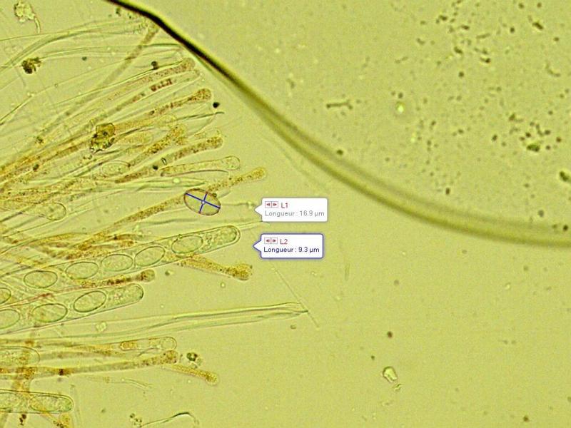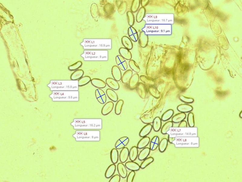 Spores lisses non guttulées (trop jeunes ?) largement ellipsoïdes apparemment lisses x 400 a l'eau 15 -18 x 8 - 11