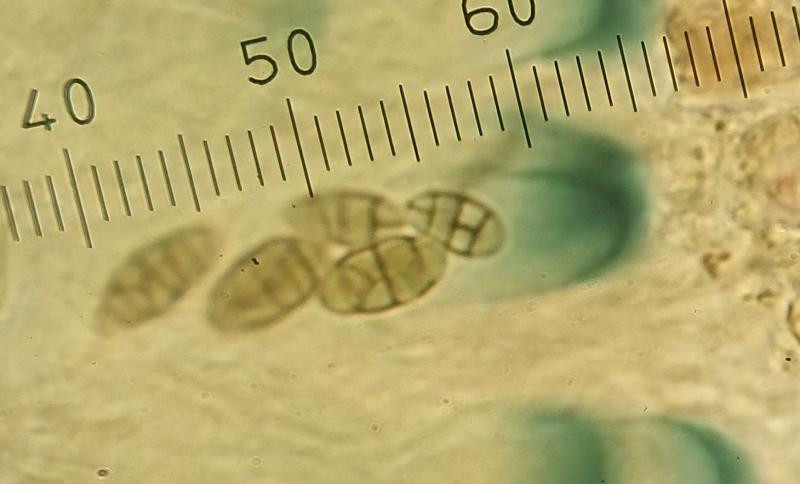Spores: brown, 13-18 x6-7, 3-6 transverse septae 1-3 longitudinal septae
