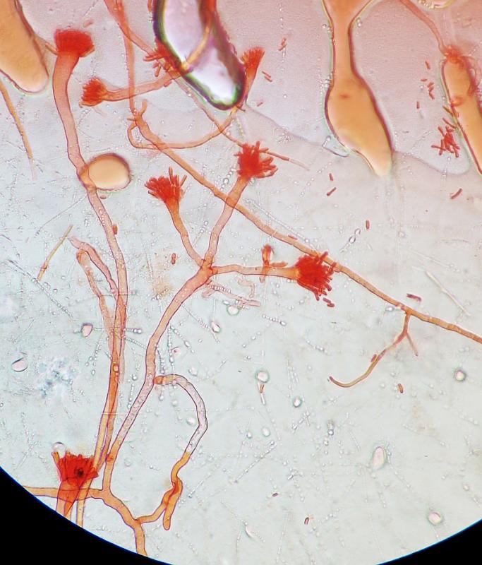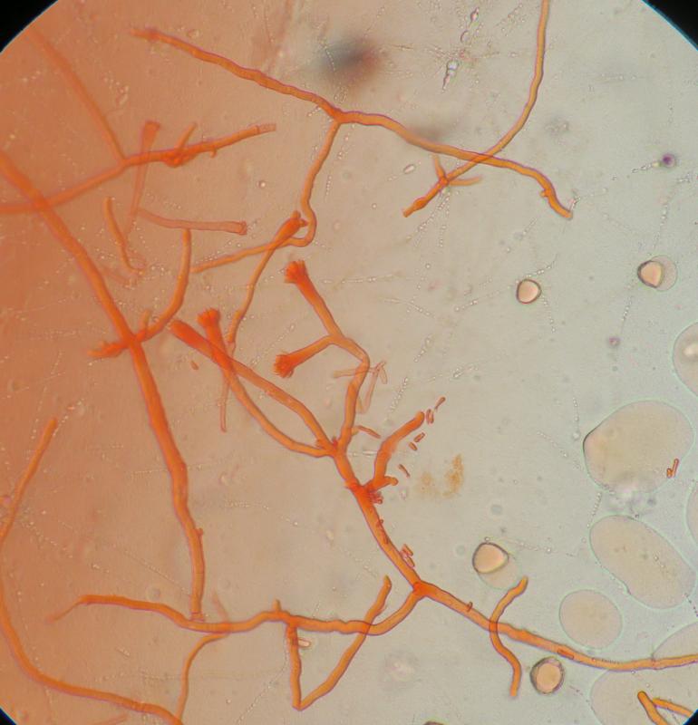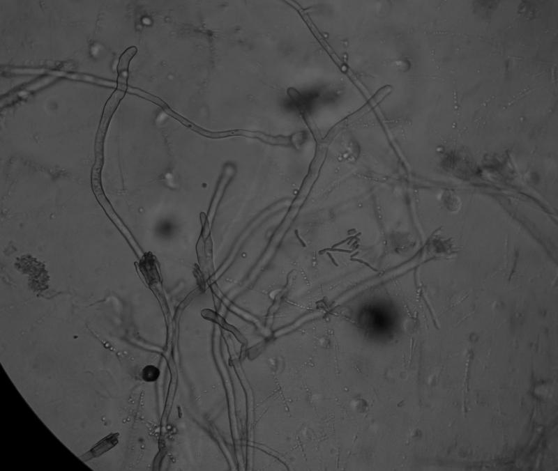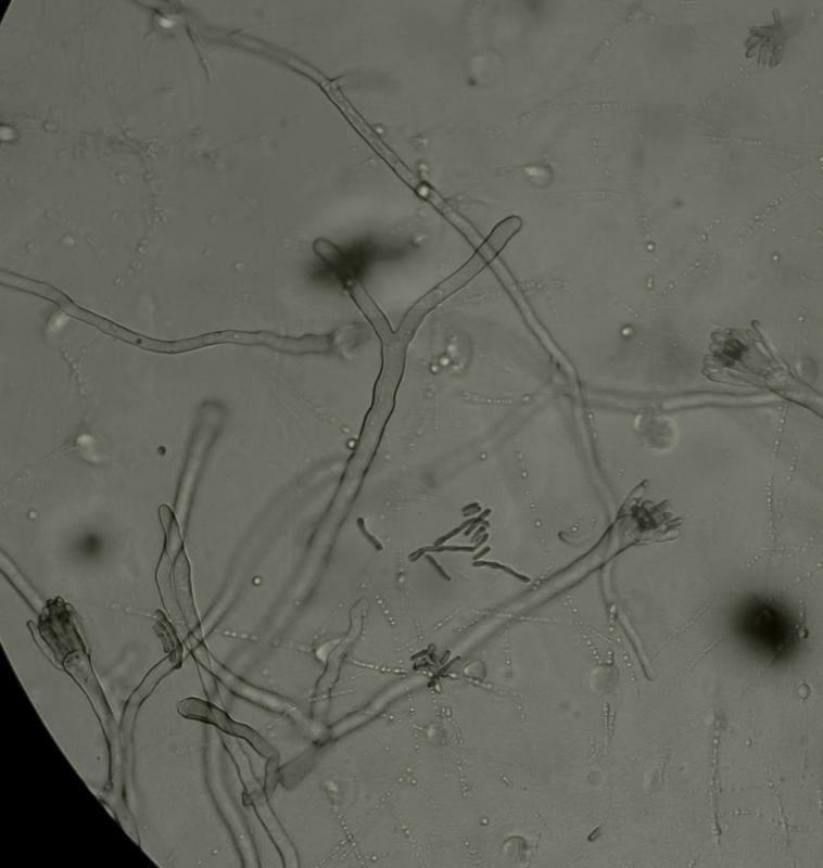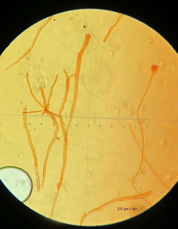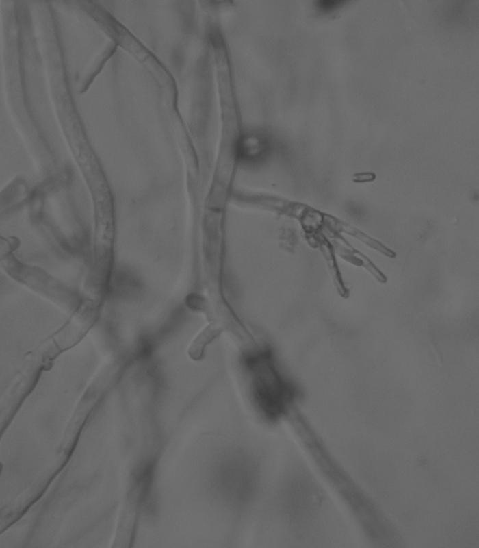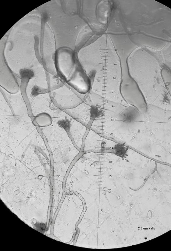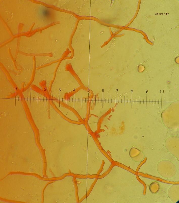 Under the microcope I saw realtively thick curved mycelia but loose and not interwoven, irregular/flexuose, septate, losely branching, 7-9 um thick, rather stout and robust. Conidiphore not numerous, thick, solitary or few branched (x3) very long, swollen at the top, penicillate conidiogenesis apparatus with few(-several) clustered phiaides (?), irregular in length like many fingers. The condiospores seems to be rectangular and of various sizes up to 12um.