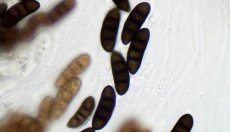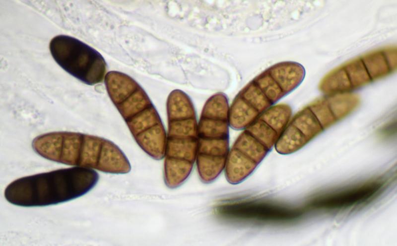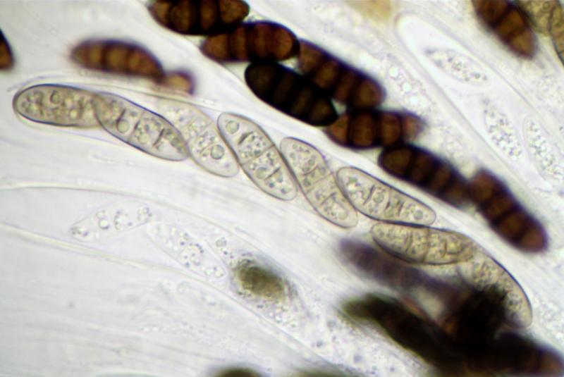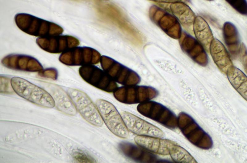 Ascospores : 20-24,5 x 7-8 um, en moyenne : 23 x 7,5 um, triseptées, brunes.