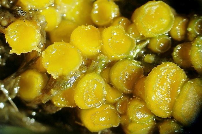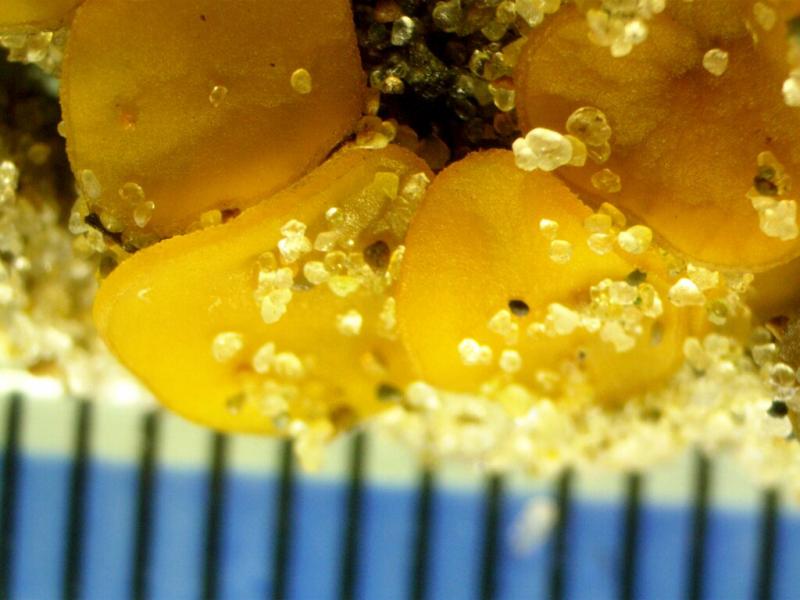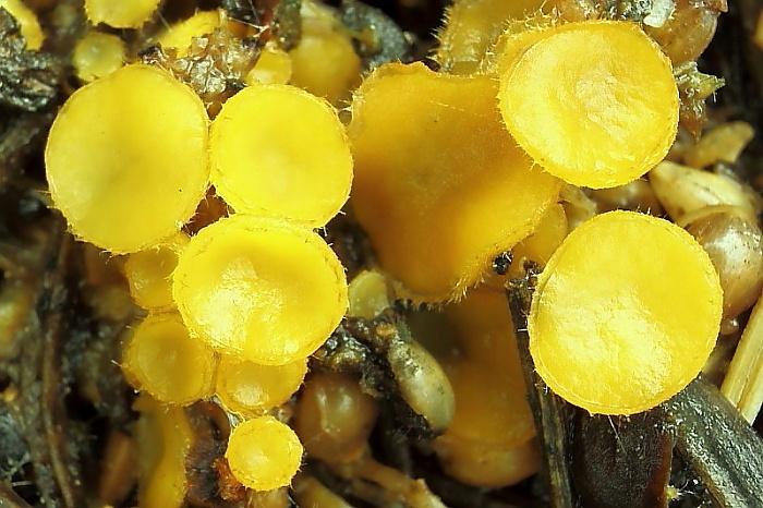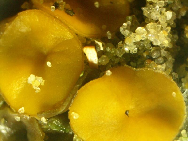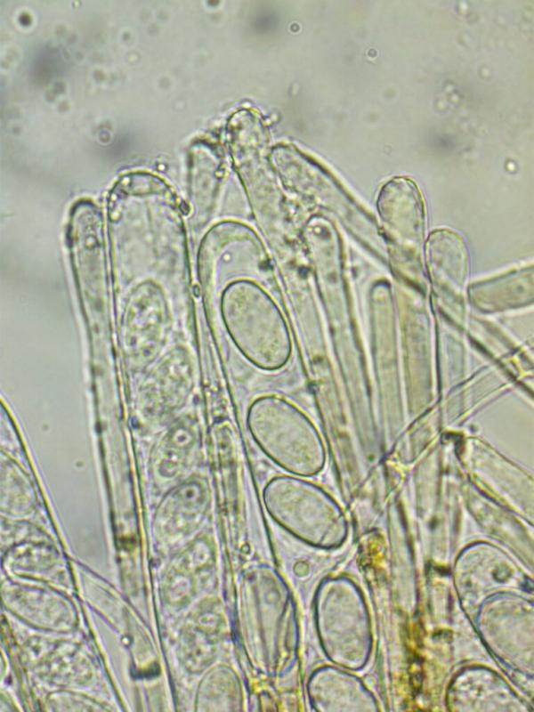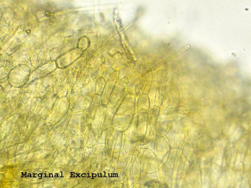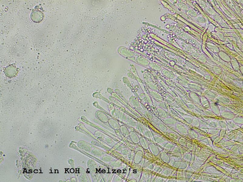 Apothecia are yellow-orange, disc shaped, up to 8mm. The margin is slightly raised and crenulate under low power. Ascospores are smooth, ellipsoid, without guttules, 17.5-22x10-13. Asci are 168-235x15-18 and without iodine reactions (Melzers). Paraphyses are slightly swollen to 6-9, some capped by amorphous matter. Excipulum is mostly a textura globosa with some cells up to 50. Some hair-like chains of cells towards the margin c100 long.
