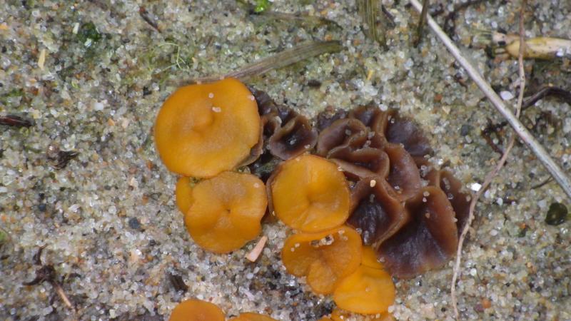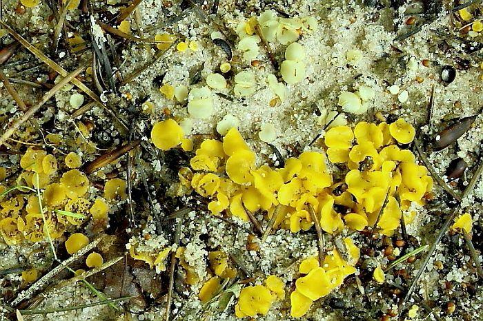 I found this yellow Discomycete on dung, presumably dog, buried in sand amongst dunes. Despite it being relatively large and conspicuous I have strugled for an ID.