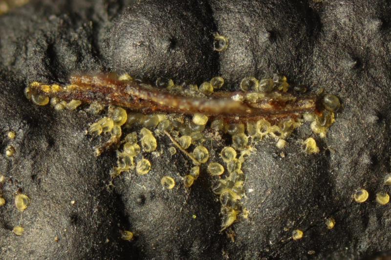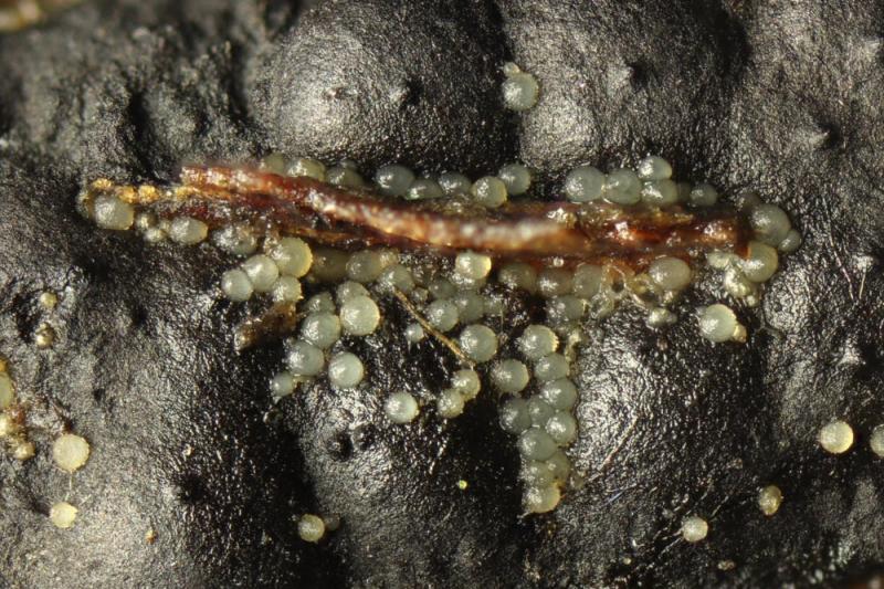 Macro: Perithecia white, glabrous, subglobose, 130-170 µm broad and 140-180 µm high, very readily collapsing when beginning to dry. When colapsed yellowish.