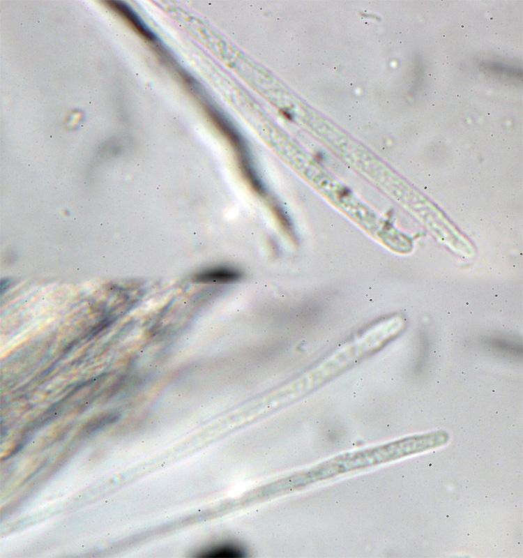 2) We observe a fruiting body fragment immersed in a KOH drop under the microscope. We do not cover the preparation with a slide. The best lenses for this purpose are: X5; X10.