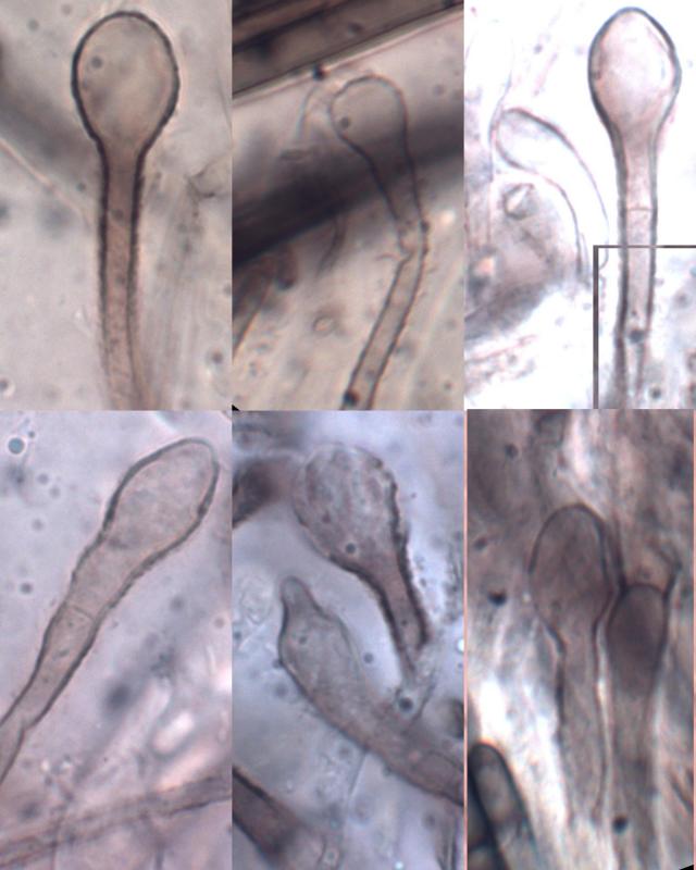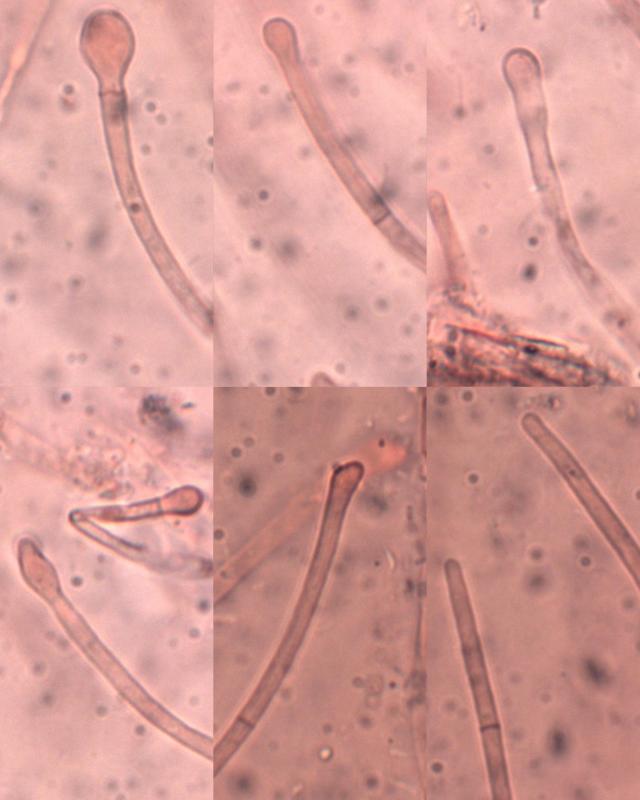 This sticky specimen has spores from 0-7 septate with about 1/3 being 3, 1/3 being 7 and the final third being split between 0,1,2,4,5 and 6. The average length was 74 (59-84). Both the paraphyses on the head and stem were bulbose and septate.