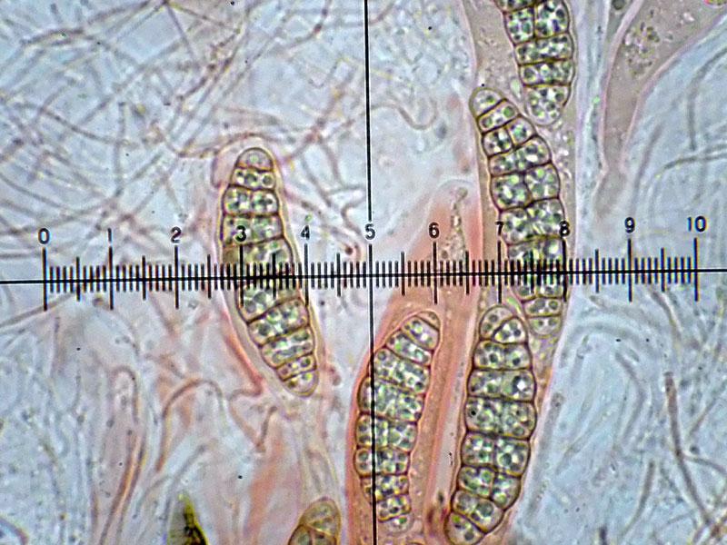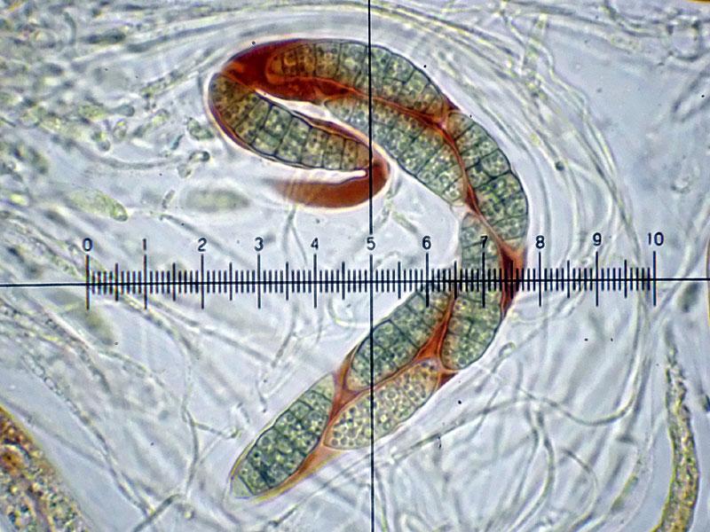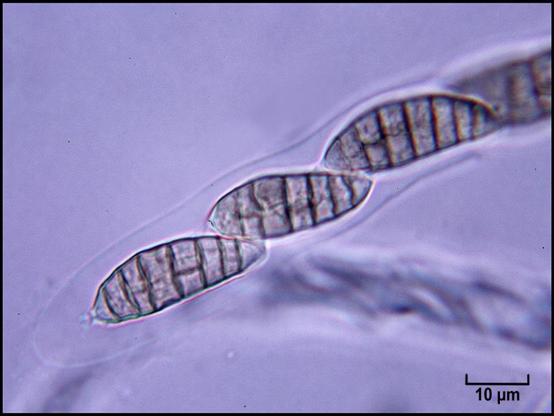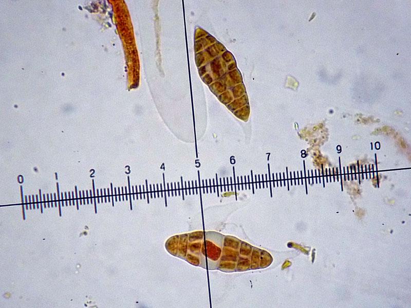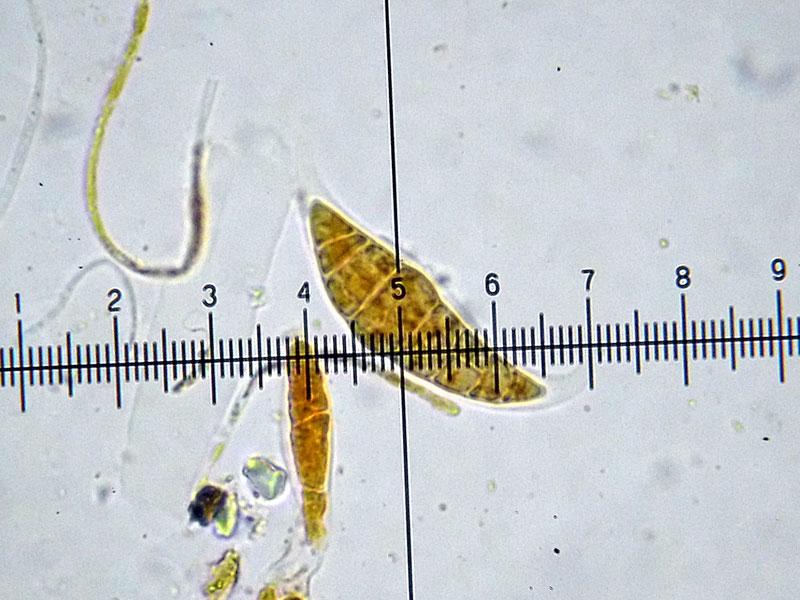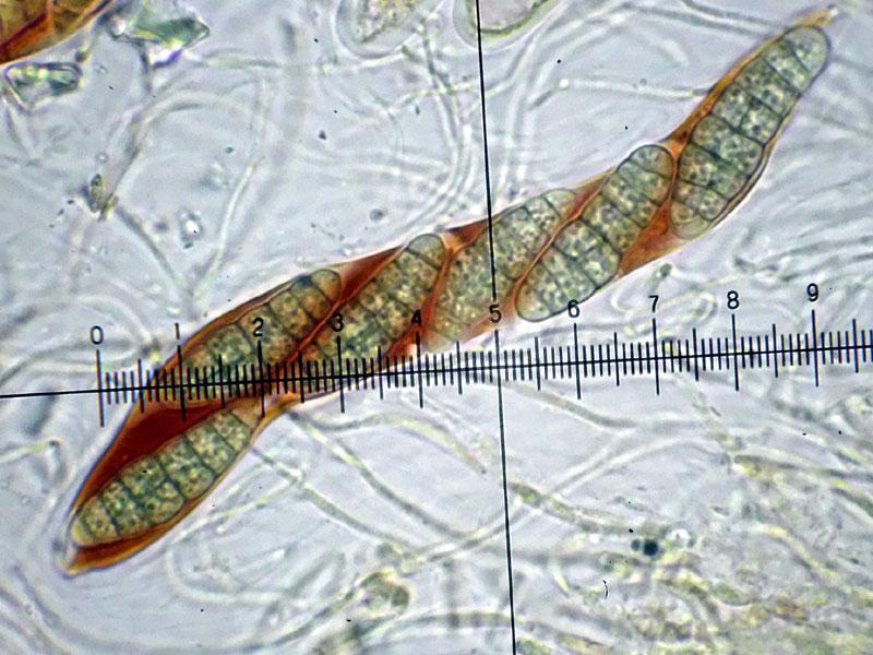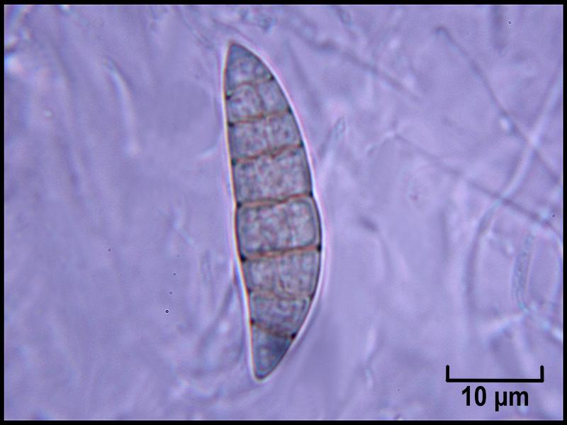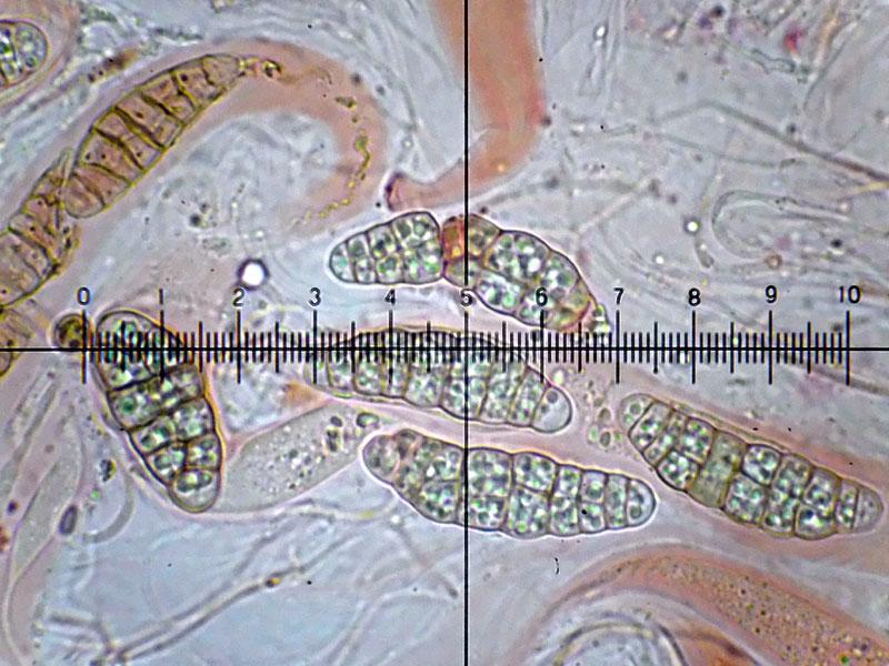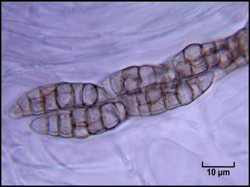 Les spores sont murinées avec 7 à 9 cloisons horizontales et plusieurs verticales. Elles sont effilées, brûnes, de 30-33 x 10 µm et semblant avoir une enveloppe gélatineuse.