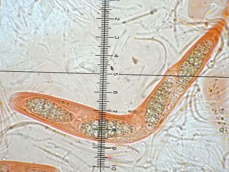 De plus on ne voit pas de spores brunes dans ces photos. Il faudrait montrer asques et spores dans l'eau. Ici les photos sont prises dans le Melzer, c'est bien cela ? Ce réactif peut montrer des choses, mais il en masque d'autres. Il semblerait que ce soit bien des asques bituniqués. Et cette présupposée Pleosporale mériterait une observation dans l'encre pour bien montrer les gangues sporales.