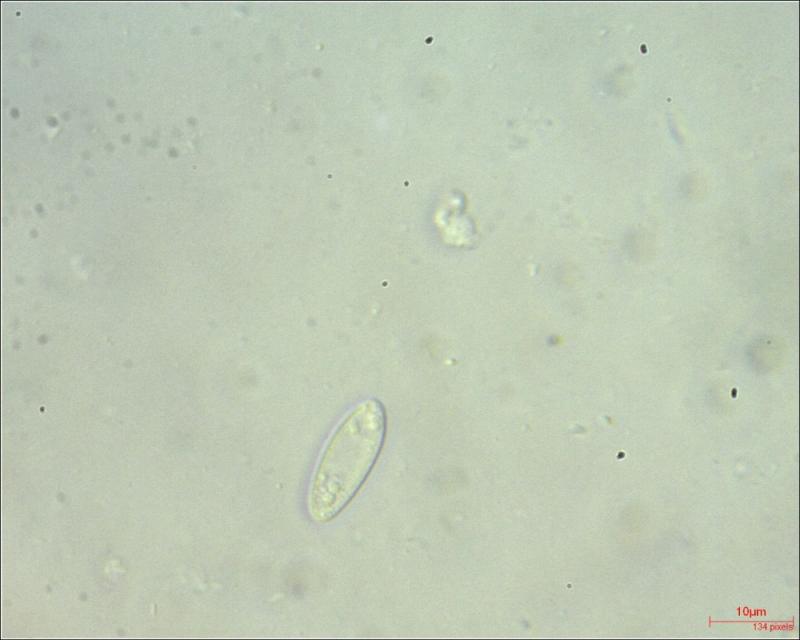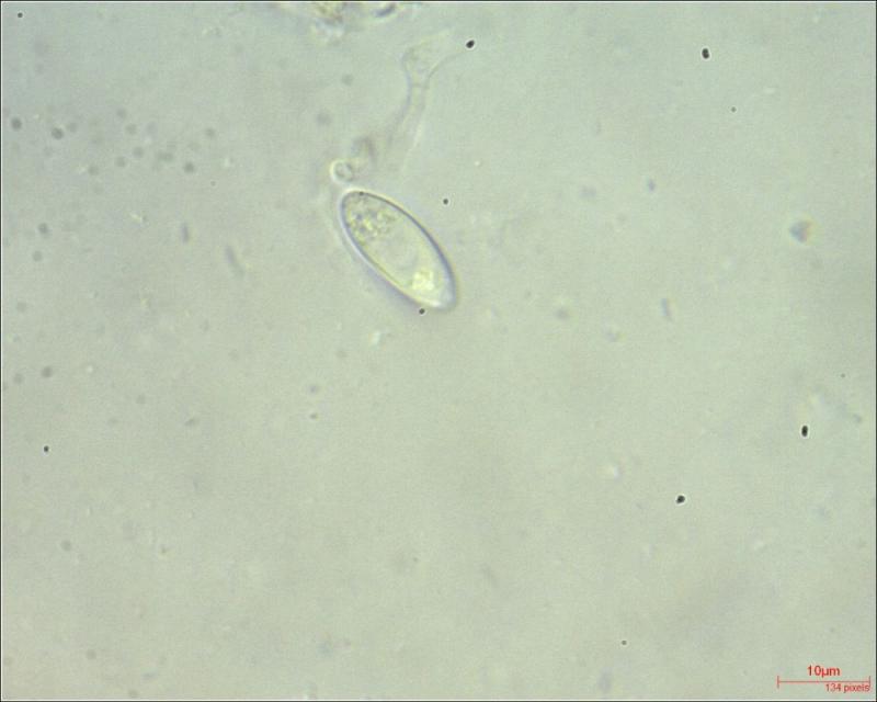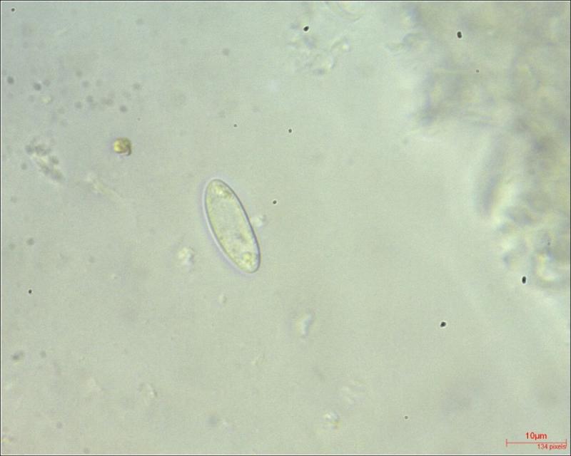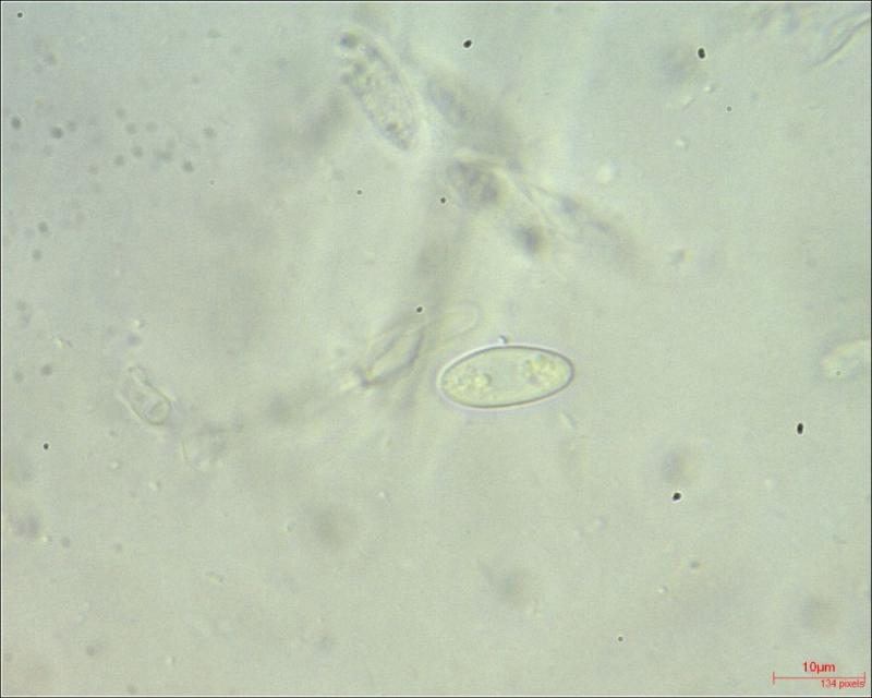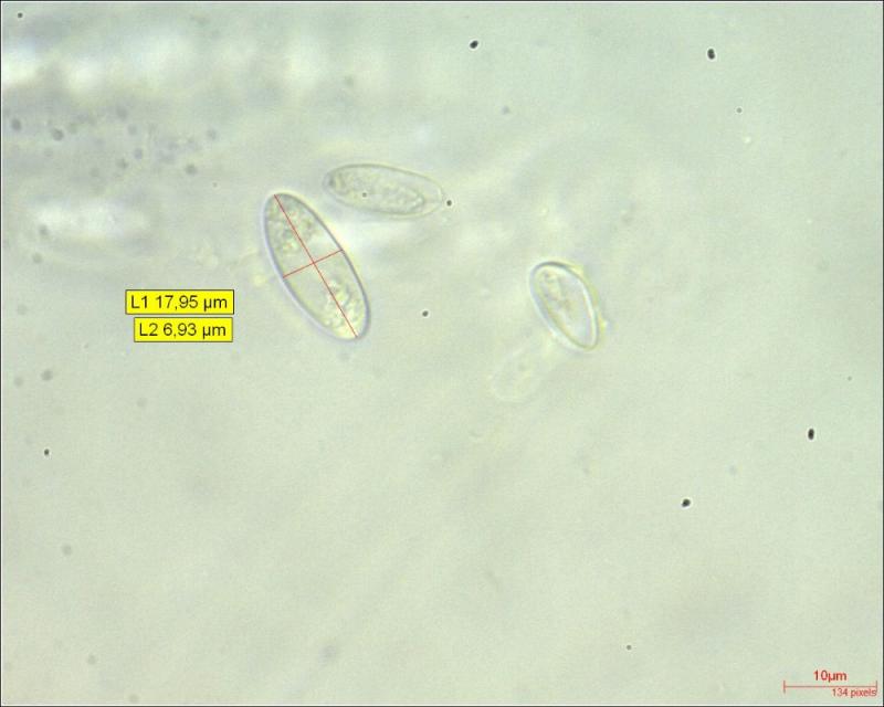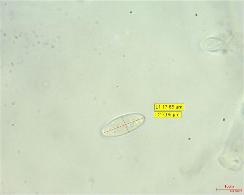 Spores: elliptical; filled at the poles with clusters of droplets; Av 16.34x6.50µm (N = 17)
