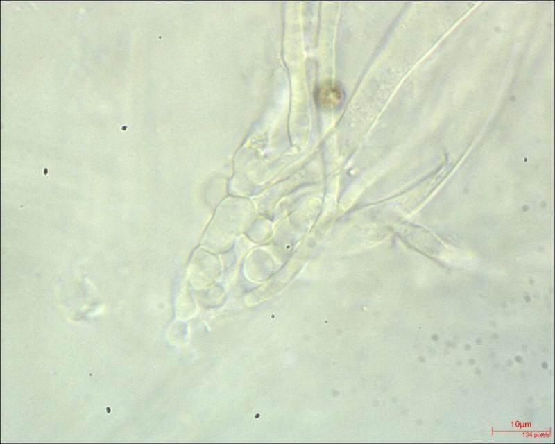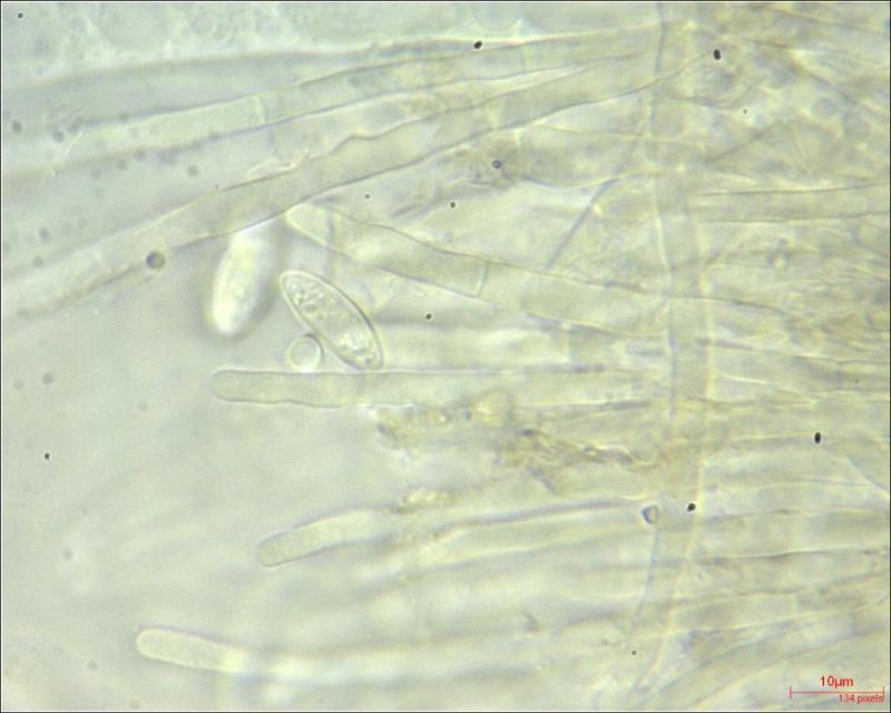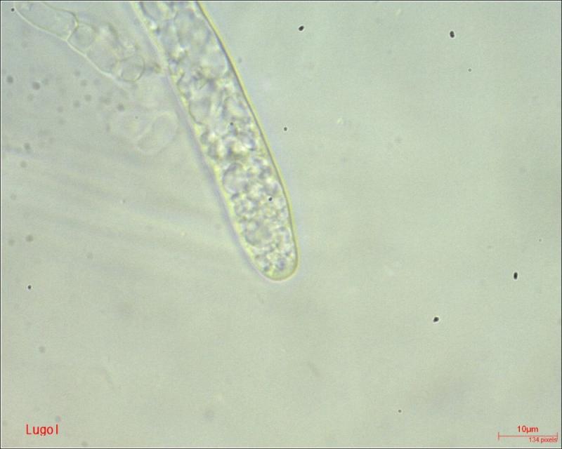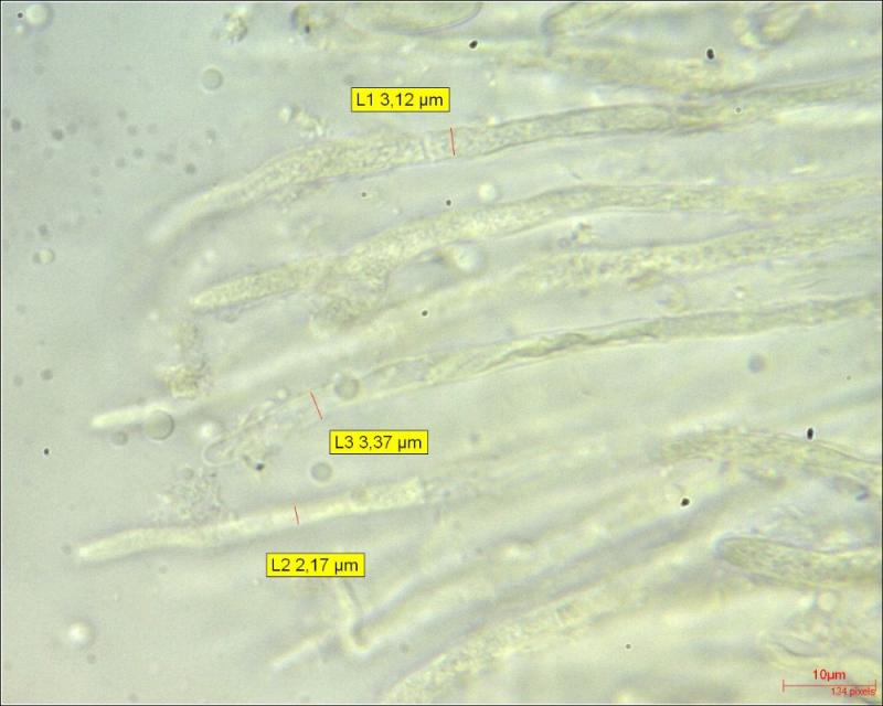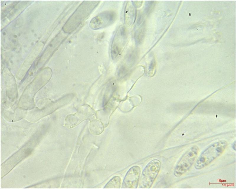 Paraphyses: filiform; cilindric; sometimes branched at the top; multiseptated; finely encrusted (?); diameter on average around 3.17 µm