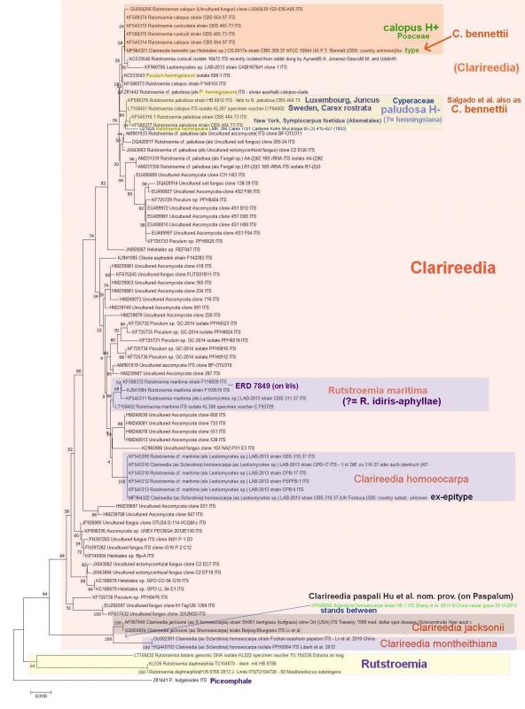 R. paludosa occurs on various grasses but has a distinct stem. Here, however, all fruiting bodies are sessile or with a very short stalk.