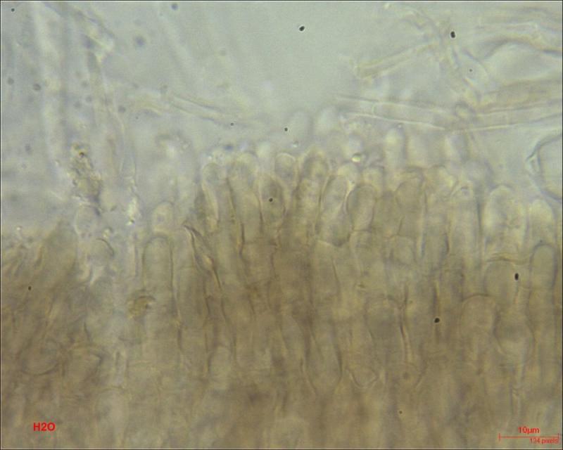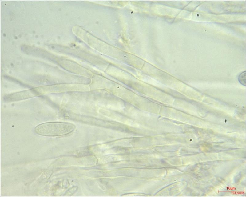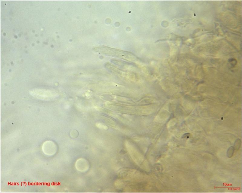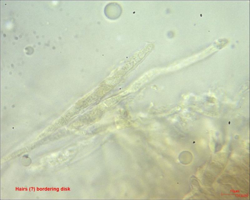 Hairs (?) or paraphyses on the edge: thick-walled; multiseptated; finely encrusted; tapered top; content colored.