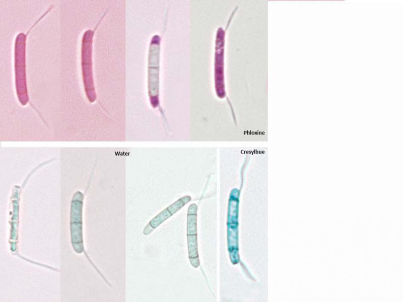 Conidia:15.7 - 18.5 × 2.1 - 2.9 µm;Av. 17.1 × 2.4 µm; Q = (4.8) 5.6 - 8.9 (9.8) ; Qav = 7.4; cylindrical to somewhat allantoid, hyaline to very light brown, 3-septate, 2nd and 3rd cell not distinctly but just a little unequal ; the third cell is 1-2(4)% shorter in length