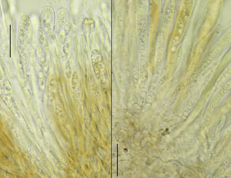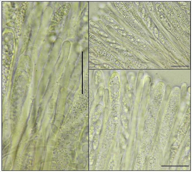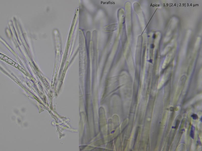 Paráfisis ensanchándose en lo alto (6-13 µm) con grandes cuerpos vacuolares alargados