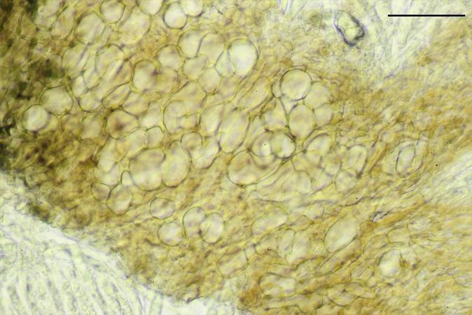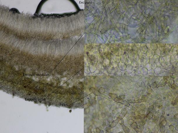 Excípulo ectal compuesto de células subglobosas y angulosas.