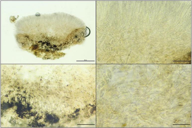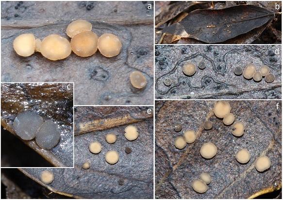 Apos discoideos, de hasta 2 mm, de sésil a subestipitado, margen ligueramente crenulado de color blanquecino, himenio de color ocre claro a ocre anaranjado, después gris oscuro.