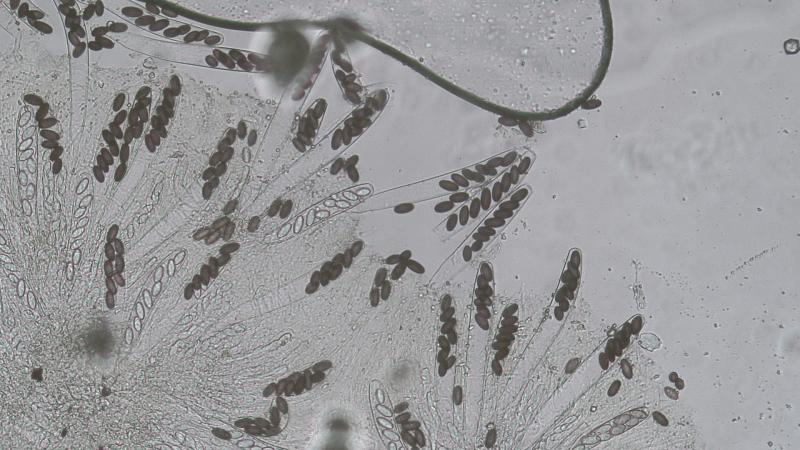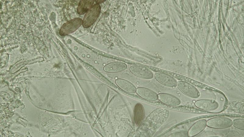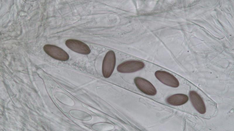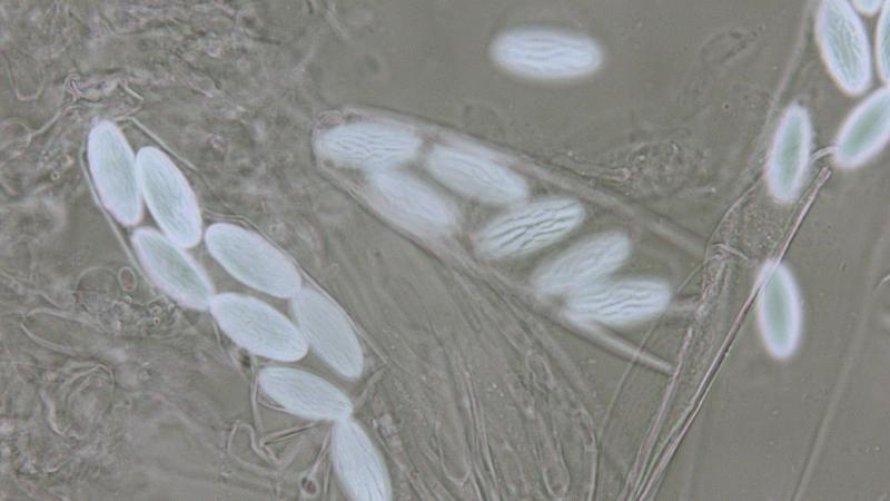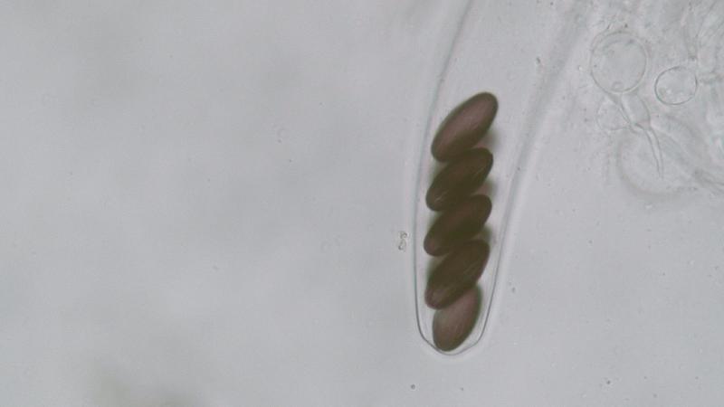 Asci: 8-spored, when enlarging in length with spores in line 222.5-240.5x21.5-27. When exanding in width in order to regroup the spores in two obliquely groups of 4 they measure 182.5-198.5x33-37 um.