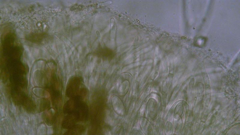 Paraphyses: septate, cylindrical, 2.2-5.1 um enlarging to 7.5-11.5 in some cases.