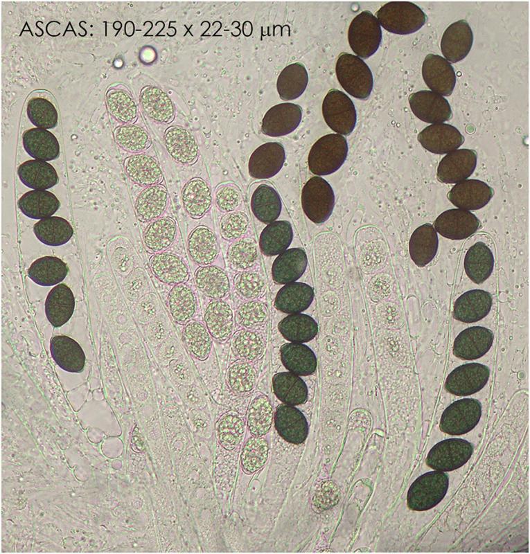 Interesante cosecha que parece estar entre A.apiculatum y A.septosporum. En tus fotos, el tabique de esporas parece más subecuatorial que ecuatorial, lo que con sus dimensiones podría acercar tu hongo al septosporum; por otro lado, los pelos en la parte superior del peritecio, los ascos y la presencia de apéndices particulares lo mantienen alejado. Para apiculatum, los apéndices son normalmente más triangulares (¿a menos que sea por los poros germinales de los hongos?) y el tabique ecuatorial. ¿Quizás una nueva especie?