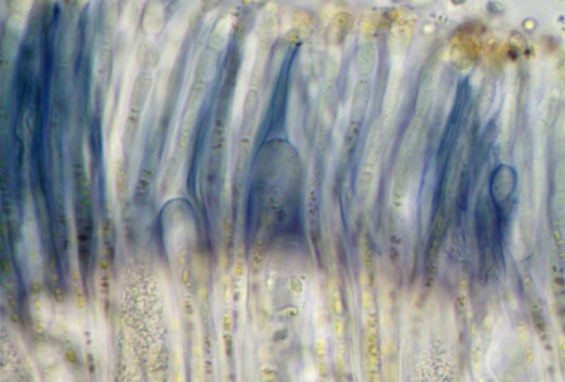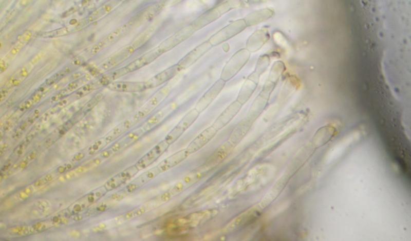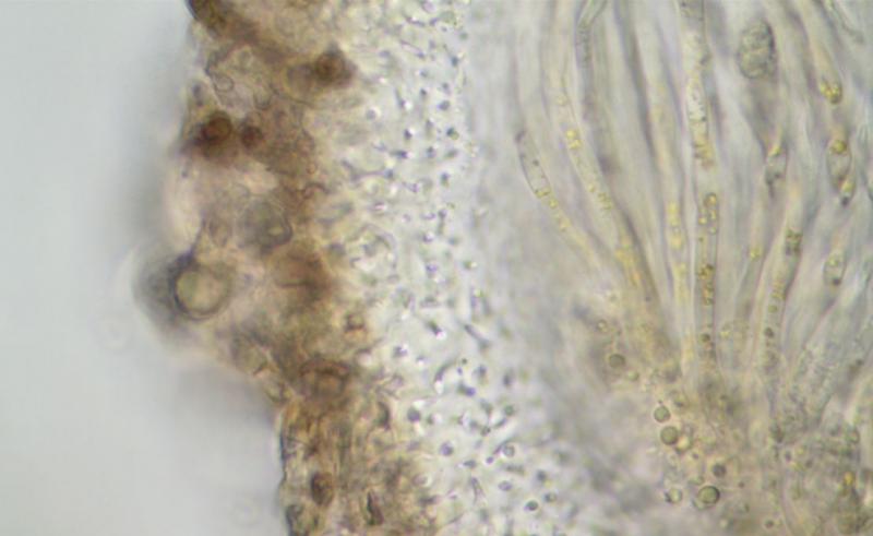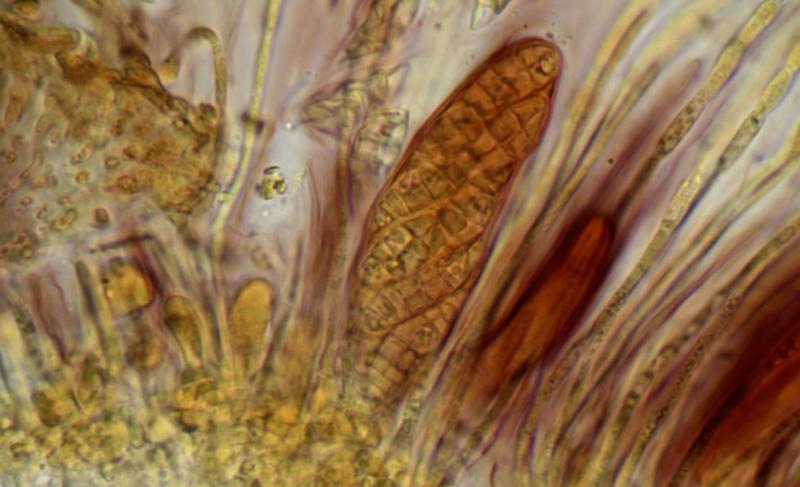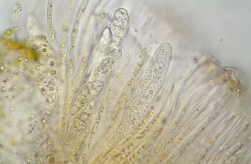 Paraphyses : moniliformes, septées, larges de 1,5-3,5 µm, garnies de guttules jaunâtres, avec un exudat brun au sommet.
