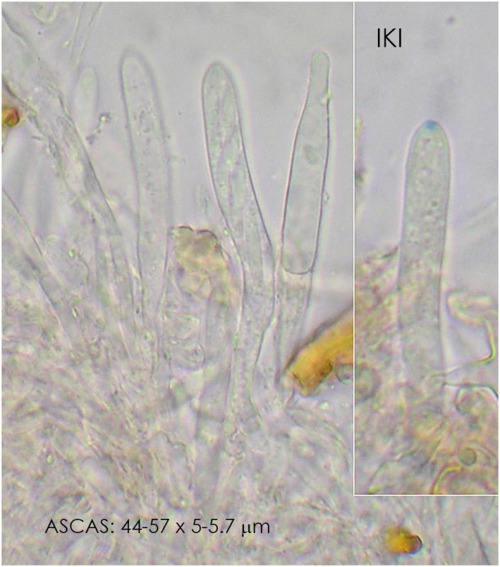 Ascas octosporadas, IKI +, con croziers en la base