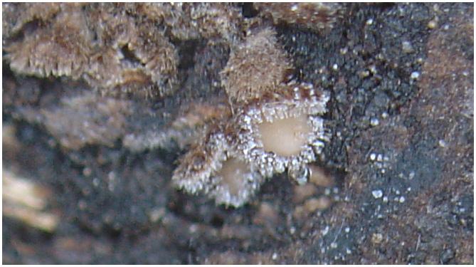 He encontrado estos apotecios (ya viejos) creciendo sobre un trozo de una rama de especie desconocida.