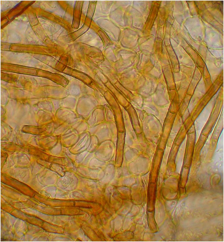 Pelos de pared gruesa, pardos, con el ápice hialino. Presencia de cristales.
