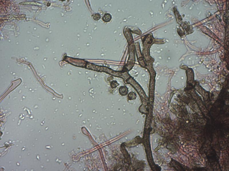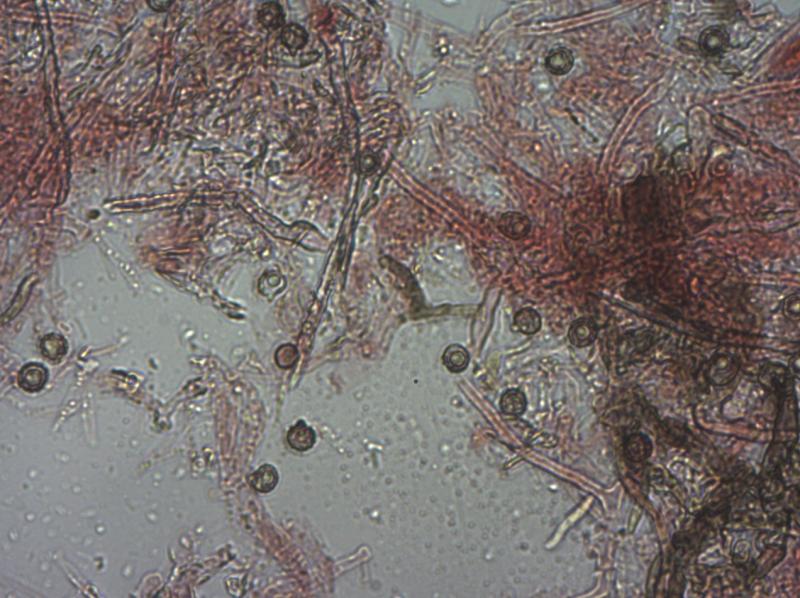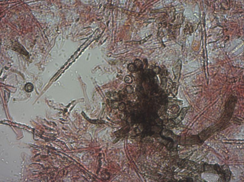 Dear Forum,Examining the crust Subulicystidium longisporum on the bark of Populus sp I found a hypho with brown conidiophores en brown warted conidiospores, subglobose with 6.5µ as longest diameter. Most of them had 1 or 2 large guttules.Any ideas?