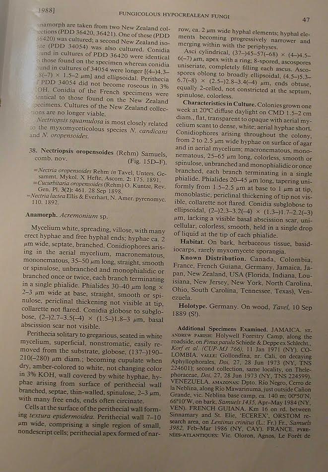 Perthecia pyriform, 0.2 mm diam., gregarious, immersed in a white subiculum, with protruding ochraceous brown ostiolum. Asci cylindrical, with 8 uniseriate ascospores, 47-60x4-5 µm.