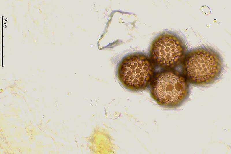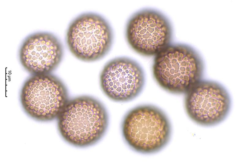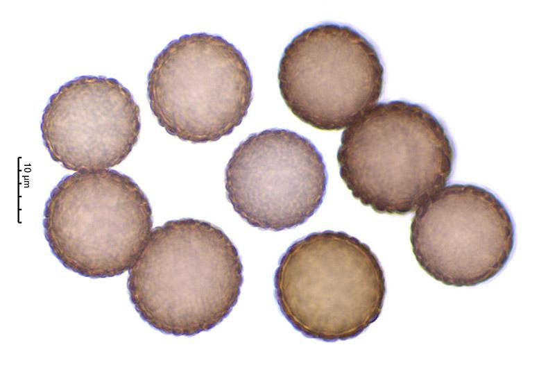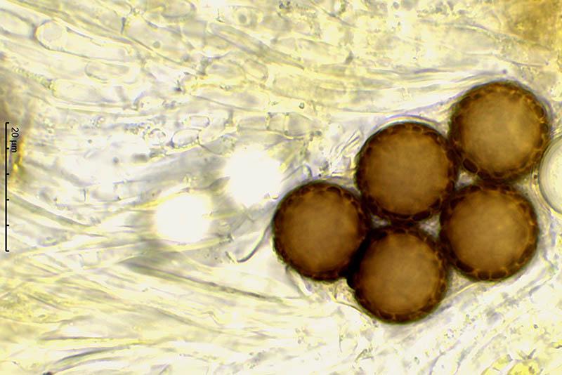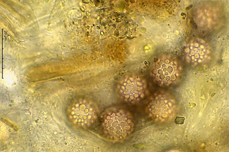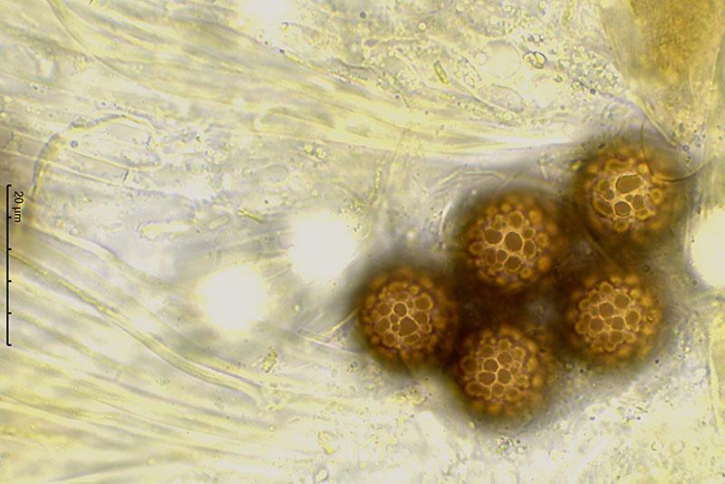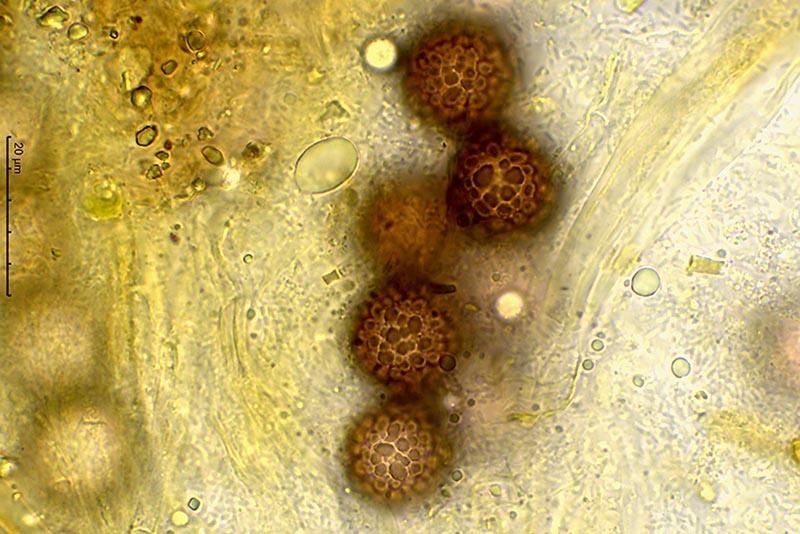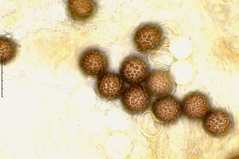 Por cierto, ahora después de medir más esporas de esporada libre el tamaño esporal ha aumentado un poco, ahora obtengo una medida de 15,4-18,8 micras al 95% de probabilidad. En algunas preparaciones se ven esporas rápidamente hiperhinchadas, de unas 20 micras, pero la ornamentación ya se ve deformada.