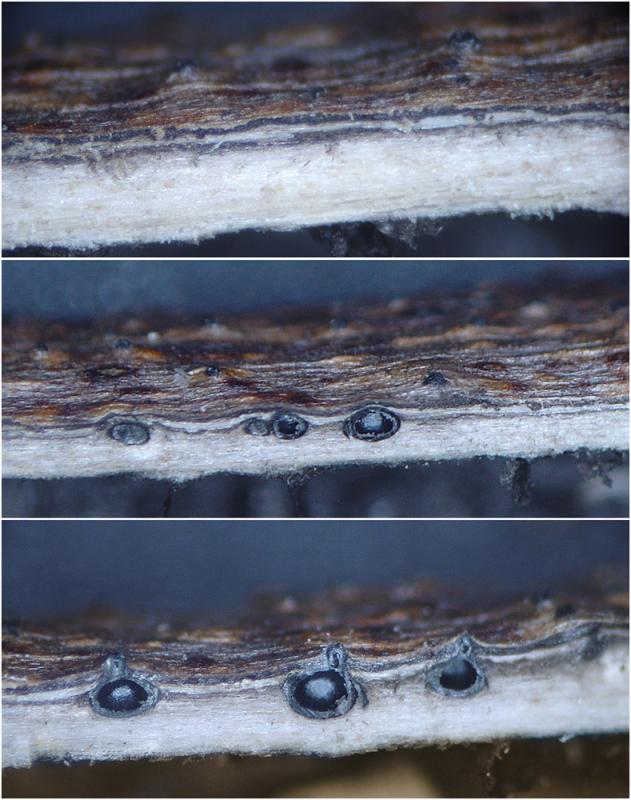 Son peritecios de 400-525um de diámetro, inmersos en la corteza, sobresaliendo los ostiolos. Crecen en grupo, aisladamente unos de otros sobre un tallo herbáceo (podría tratarse de Sambucus ebulus).