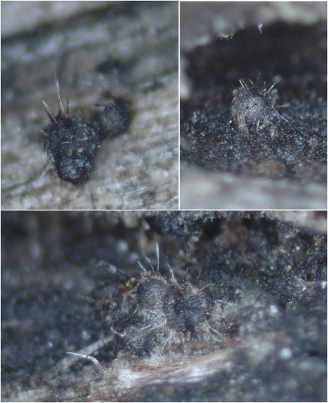 He encontrado este ascomyceto creciendo sobre una rama de avellano. Concretamente bajo la corteza en una zona agrietada de la misma. La rama estaba en el arbol. Se trata de peritecios globosos-piriformes, con setas en torno al ostiolo.