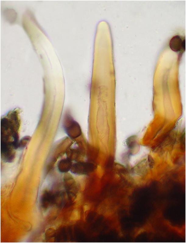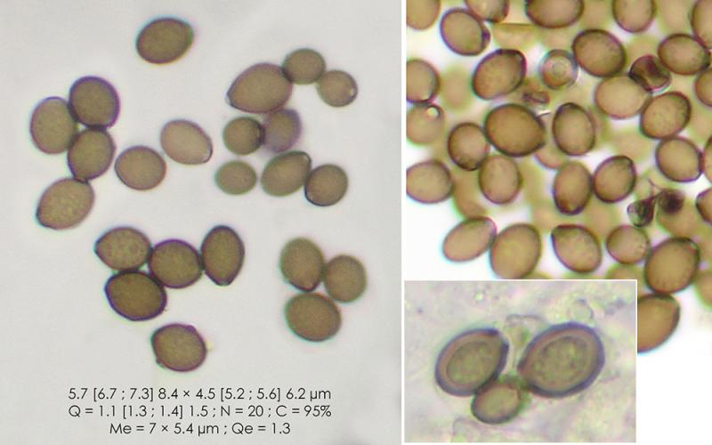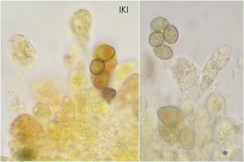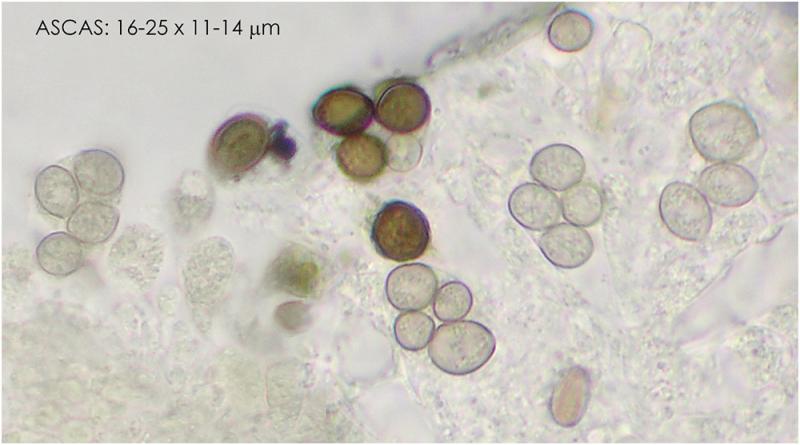 Microscopicamente presenta ascas clavadas-subglobosas con 4 esporas. Las esporas son pardas, de pared gruesa y con un evidente poro germinativo en uno de los polos.