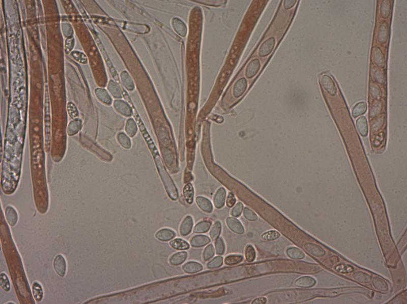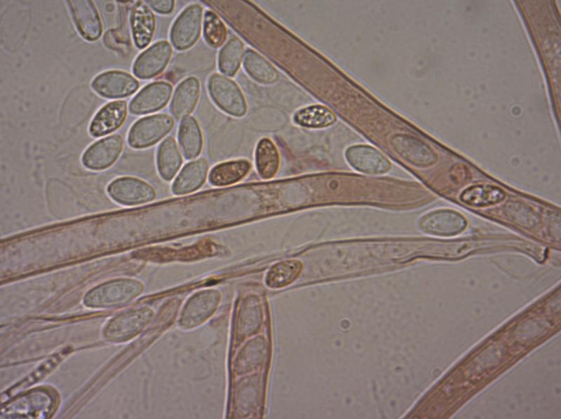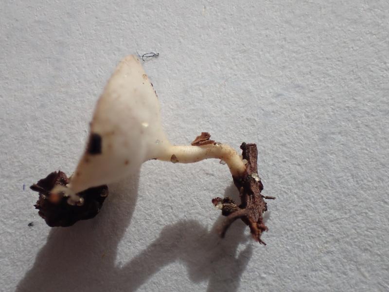 In the coastal dunes of Belgium on a small branch of Hippophae I found a whitish cup-shaped fruiting body of about 5mm. The stalk was black at the base.Ascus 8-spored, uniseriate, 136x9µ, apical apparatus J+, spores amygdaliform 10x 5.1-5.4µ some with guttules.Excipulum text. angularis.
