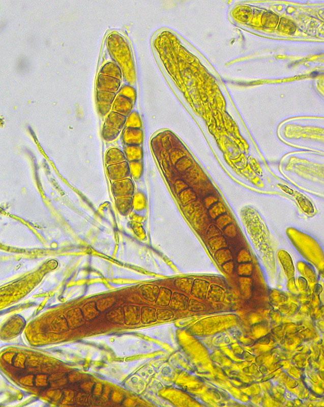 Spores hyaline, with 4 cells, constricted at the septa.
