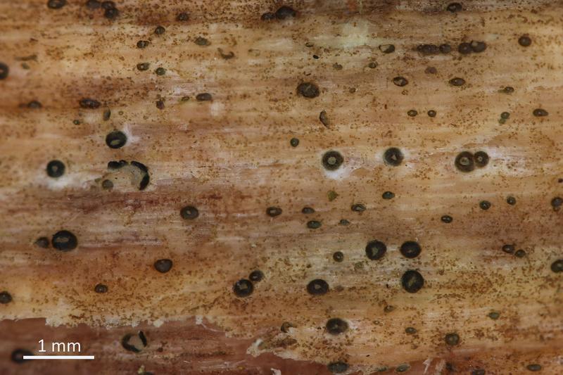 Fruitbodies max. 0,3 mm of diameter, opening by a hole or a slit, outside dark olive, hymenium light green. They are superficial, not erumpent.