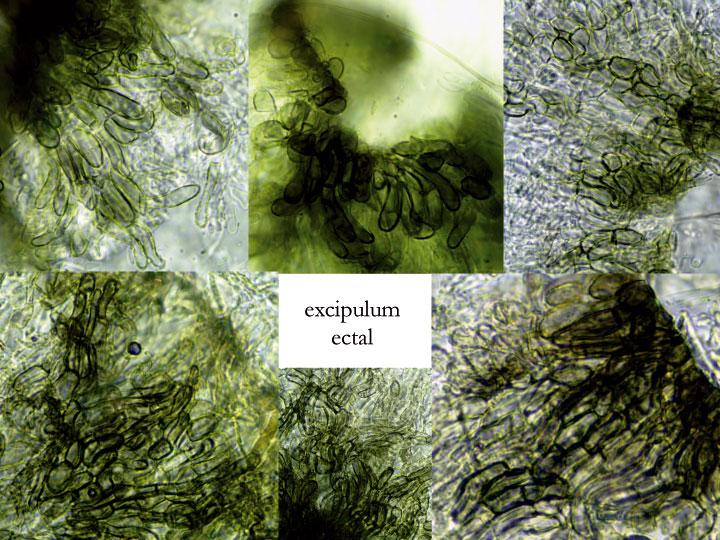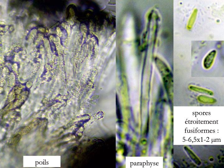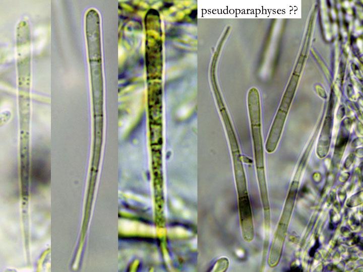 Parmi les éléments curieux observés il y a ceux que j'ai nommés temporairement "pseudoparaphyses" car je ne sais pas comment les nommer et je ne vois pas bien où elles se situent normalement au niveau de l'hyménium.