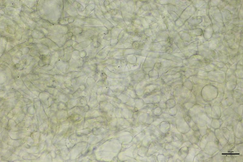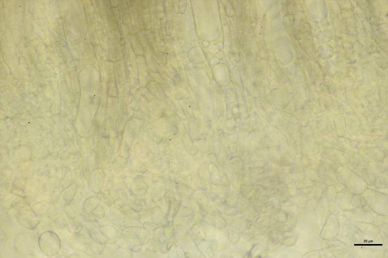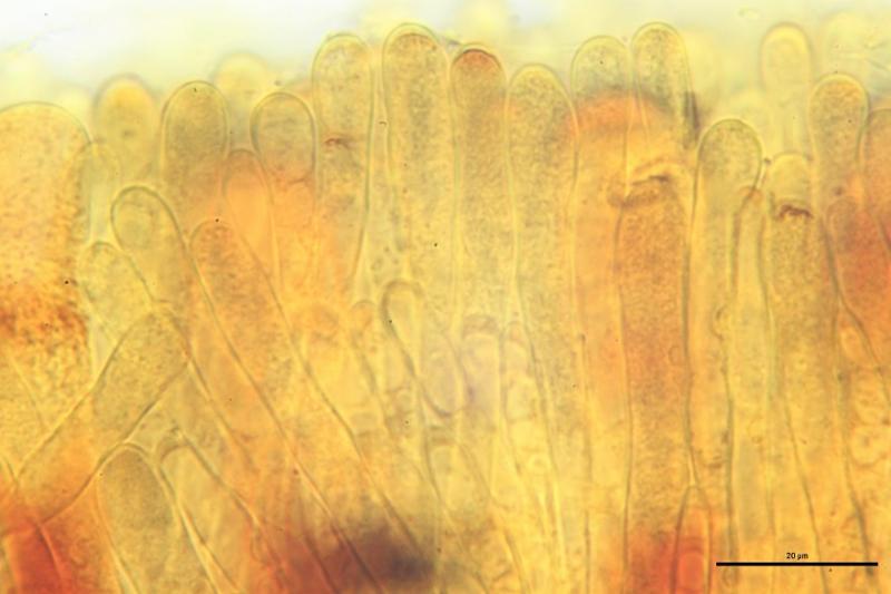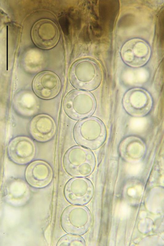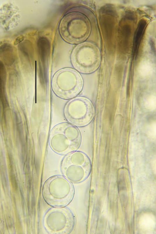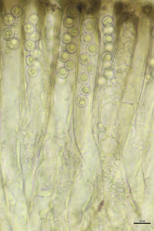 He repasado una colección recolectada en Málaga con M.Vega de Peziza pseudoanthracina y comparte algunas similitudes con este género, pigmentos, esporas esféricas etc., aunque débilmente amiloide (Adjunto foto), resulta difícil creer que es una Peziza, he notado que esta especie presenta un E. medular de células subglobosas y angulosa muy evidente, similar también a especies del genero Marcelleina, en la especie que presento, la capa de células angulosas del E. ectal es muy corta y pronto se vuelve intrincada. Tampoco me parece descabellado lo que comenta Raúl, que pueda ser una Helvellaceaea, intentaré ver los cuatro núcleos que comentas, creo que con IKI muy rebajado pueden verse bien?, al menos en otras especies funciona.