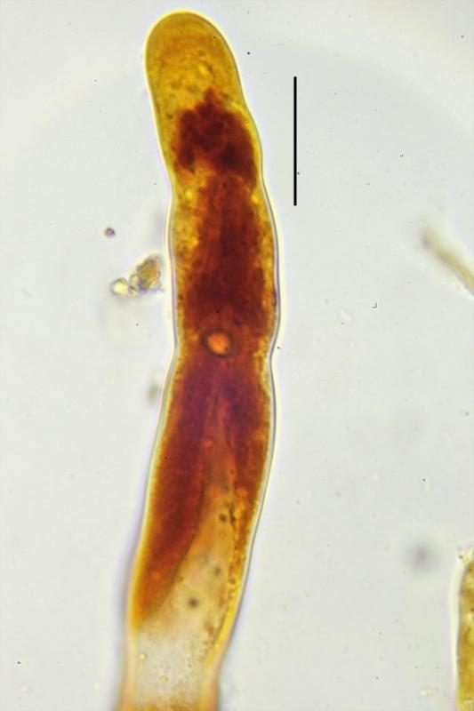 Paráfisis claviformes, con pigmento marrón, se ponen verdes azuladas en contacto con Lugol (IKI)