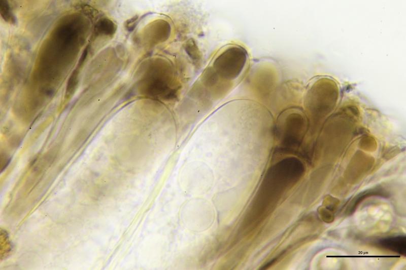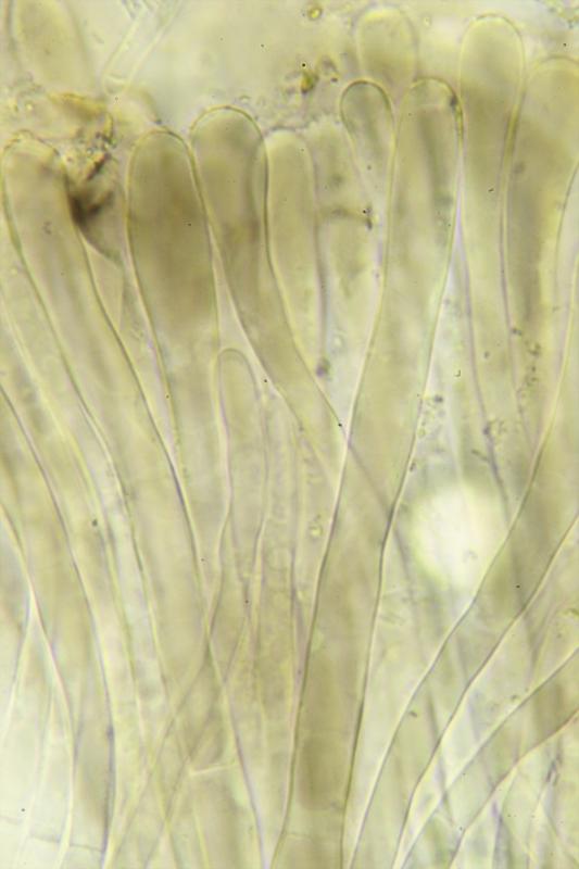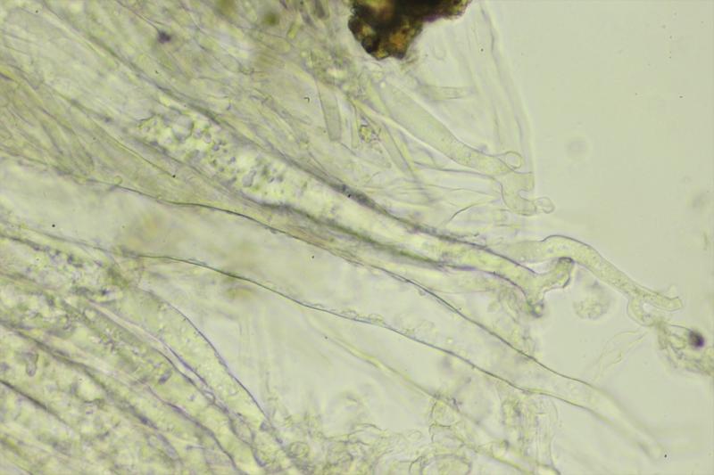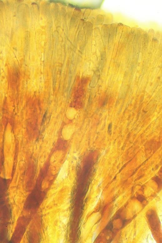 Adjunto foto de paráfisis en IKI, es una reacción azul débil al entrar en contacto el reactivo con los pigmentos de las paráfisis y del hábitat.