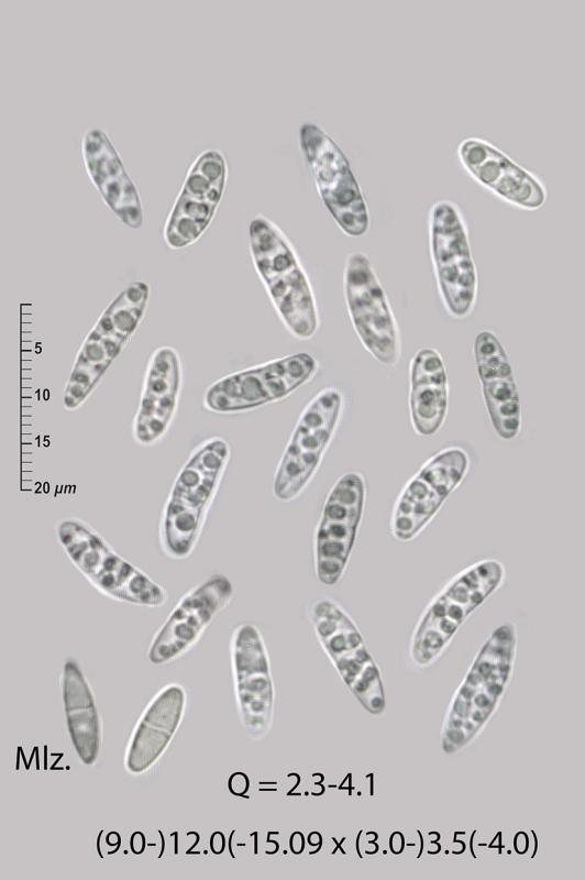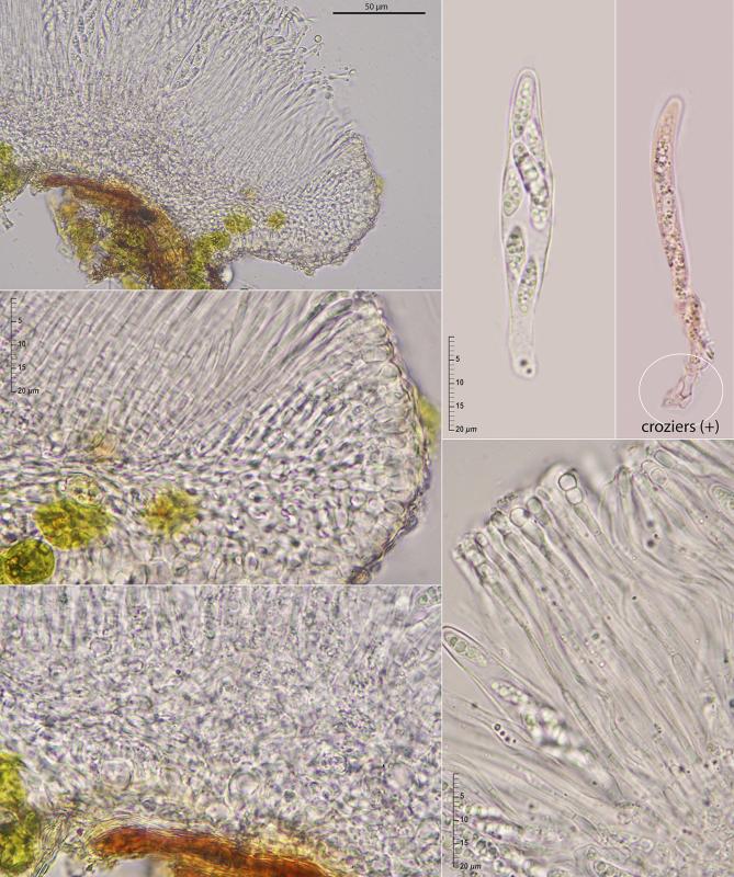 The asci are ventricose, slightly dextrinoid in IKI, with croziers and a broad, very bluish apical apparatus in IKI, and contain eight spores already septate even inside the asci. The paraphyses are moniliform near the apex and the marginal hairs are similar and closely agglutinated.