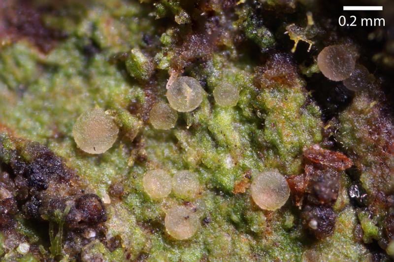 White apothecia on Pseudotsuga