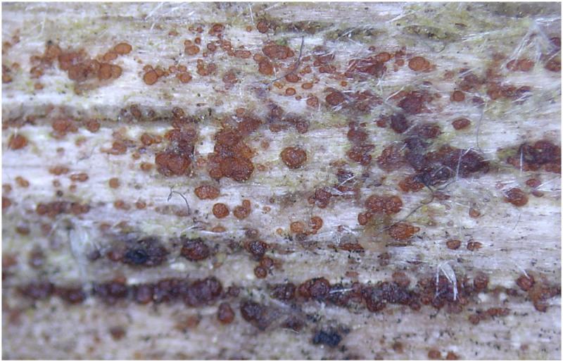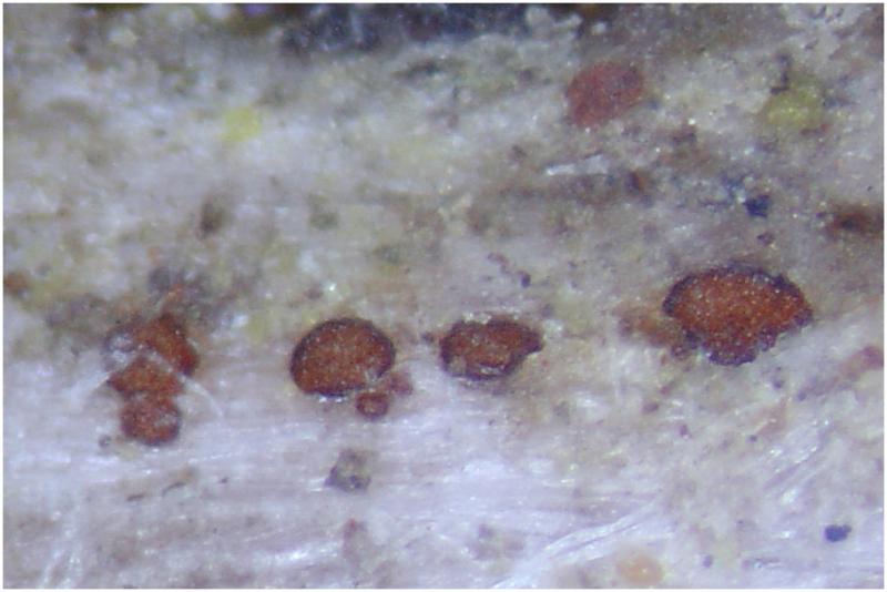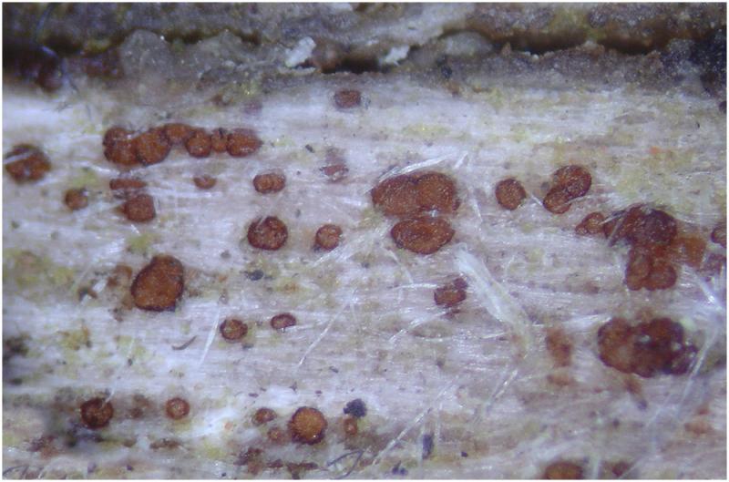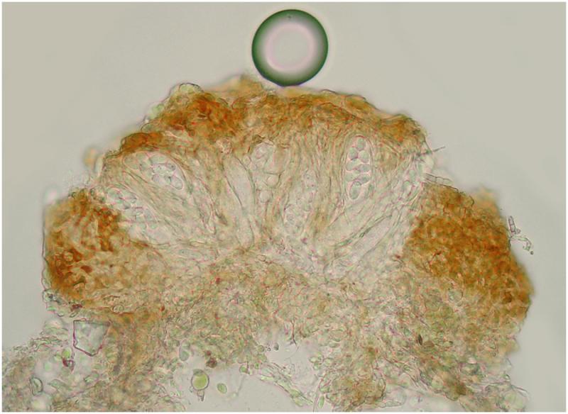 Encontré este apotecios creciendo con abundancia sobre una rama caida, descortezada de planifolio, probablemente de castaño. El tamaño hasta 250um de diámetro.