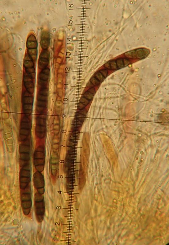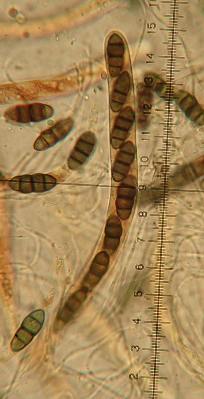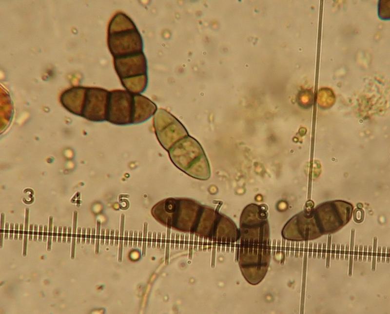 Spores brunes, triseptées, avec cellules aux extrémités légèrement plus claires, de dimensions : 15,3-21,8 x 6,1-8 µm  Q=2,1-3,2 et N=30