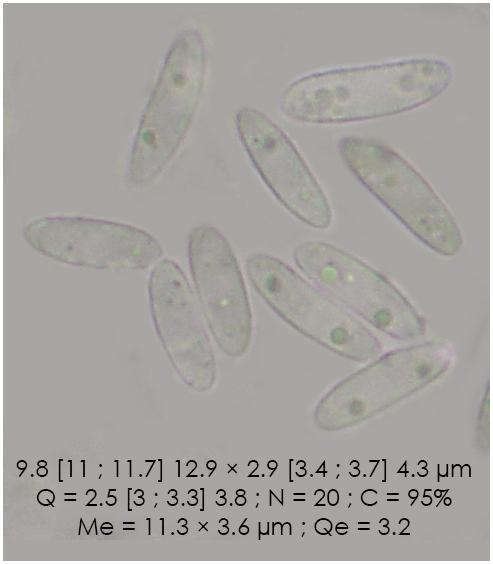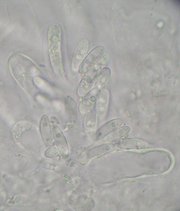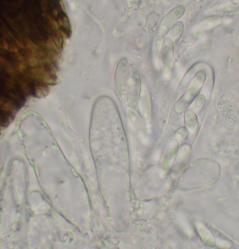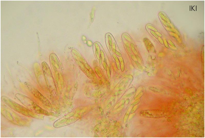 Microscópicamente presentan ascas octosporadas, biseriadas. Las esporas son mayoritariamente unicelulares, hialinas, con dos gútulas medianas y alguna más pequeña. Pero también se pueden ver esporas con un septo central. Con IKI todo el himenio se vuelve claramente rojo (dextrinoide).