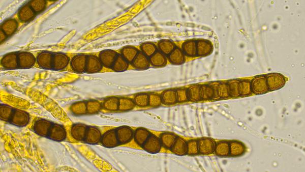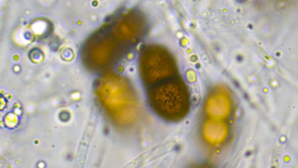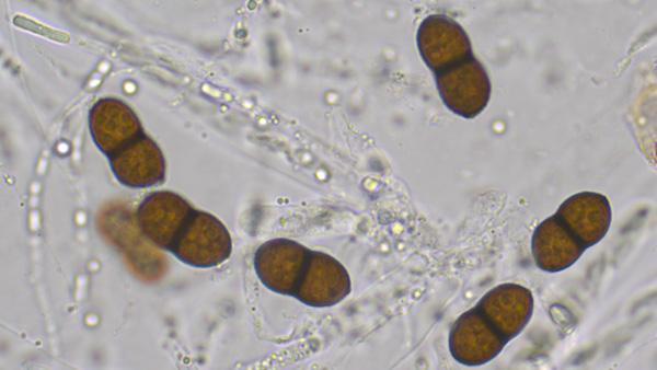Spores dark brown, 2-celled, inner wall slightly rough-warted(?), with an inconspicuous germ pore, 15-19 x 8-9.5 µm.