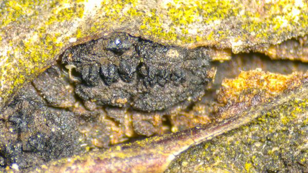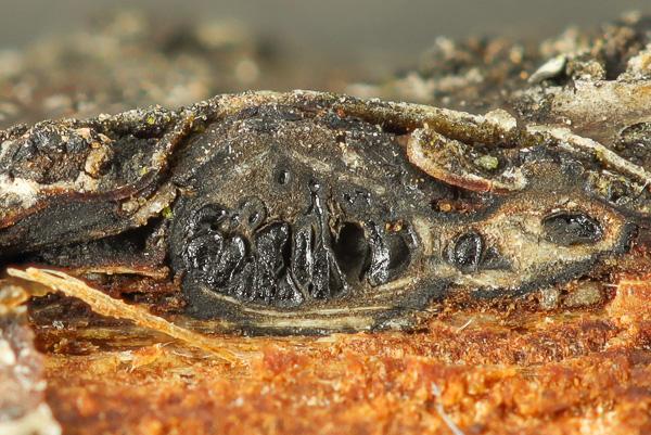 Macro: Stromata up to 3 mm in diameter. Perithecia clustered in a valsoid manner, surrounded with a rather loose blackish brown entostromatal tissue. Stromatal disc tearing through bark, exposing slightly stellate, black ostioles surrounded by a dark brown tissue.