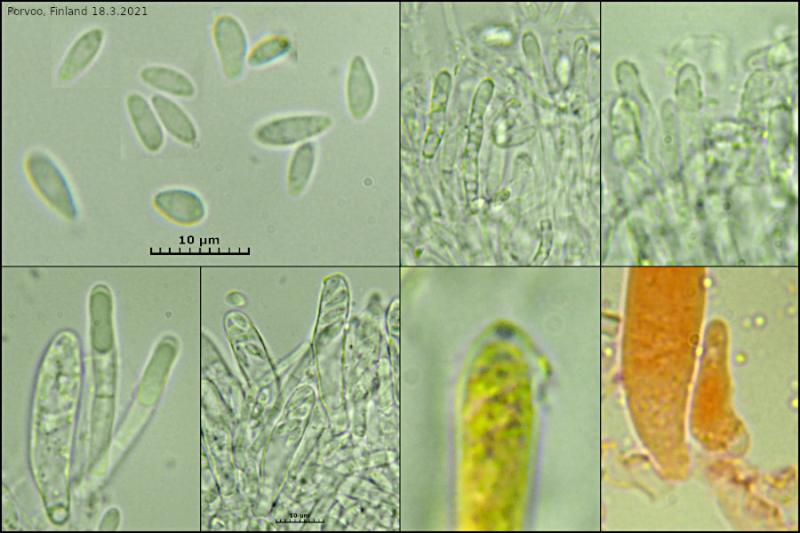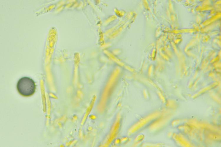 The apos have a thin stipe. Asci with croziers, IKI+ blackish, measuring 27 - 34 × 6.5 microns. Paraphyses cylindrical, with a long VB. Some minutely warted outer hairs. The spores have a some tiny oil droplets and they measure 4.9 - 7.7 × 1.8 - 3.1 microns.