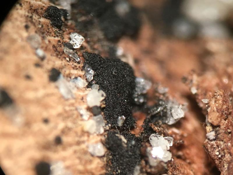 A couple of weeks ago in Central Park in New York on unidentified wood. This anamorph reminds me a bit of Berkleasmium, but I don't find a match. The black mass of conidia is tough and tar-like. Conidia are brown, but become hyaline near the point of attachment to the conidiophore. They have around six to eight transverse septa and some longitudinal ones as well. They measure 50-57 x 18-20µm.