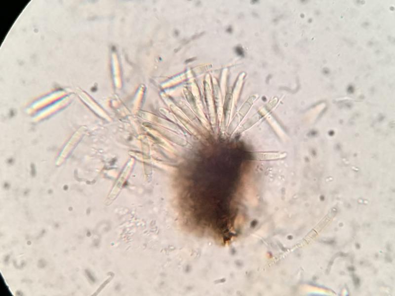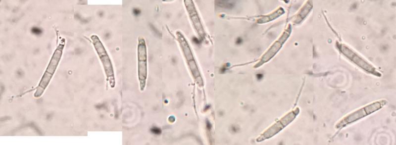 The conidia are hyaline, fusiform, 3-septate, usually with 2 long setulae emerging from one side of the conidiospore near the outer septa. Many of the conidia I observed had deformed outer cells as though those cells were deflated or malformed. I'm not sure if that is an important feature or if it's an anomoly caused by environmental factors. Conidia size: (14.5) 18-20 x 3µm, the setulae range from 5-14µm in length. The conidia were almost uniformly 3µm wide, without any variation.