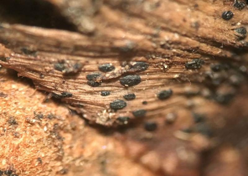 The pycnidia are black, lightly striate, elliptical, flat, sometimes with a pore or ostiole developing in the center. They are smaller than 1mm in length.Â